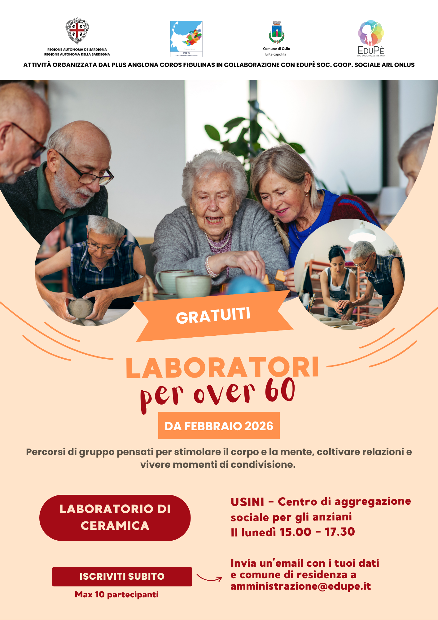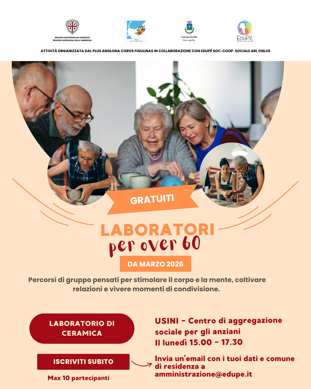 Il Comune di Usini in collaborazione con il PLUS Anglona Coros Figulinas e la Coop. Edupè nell'ambito del Fondo Nazione delle Politiche sociali (FNPS) area 1 “Anziani Autosufficienti”, organizza un ciclo di laboratori gratuiti di ceramica dedicati alle persone over 60, un’occasione per sperimentare la creatività, coltivare nuove relazioni e vivere momenti di benessere condiviso.